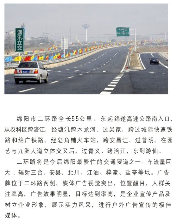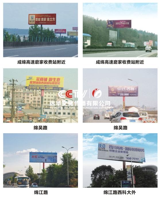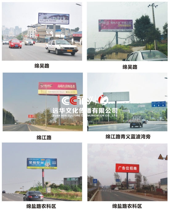 公司擁有單立柱及戶外大牌100余個,分布在成綿高速磨家收費站、綿鹽路、綿三路、綿江路、綿梓路、綿陽農(nóng)科區(qū)、綿安路、科學(xué)城、二環(huán)路等。可應(yīng)客戶需求建立、審批、發(fā)布戶外單立柱廣告牌。